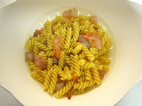 In a large pot of boiling salted water, cook pasta until al dente according to package instructions; drain well. Add the raw shrimp to the warm pasta and gently toss to combine. (The heat from the pasta will partially cook the shrimp.)