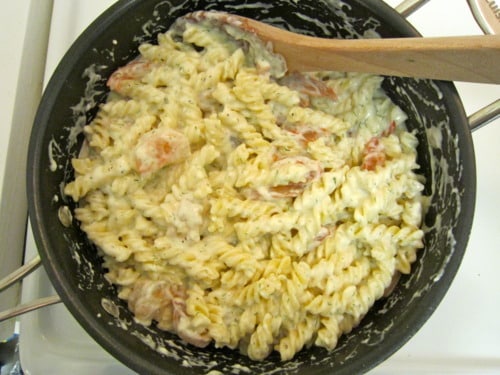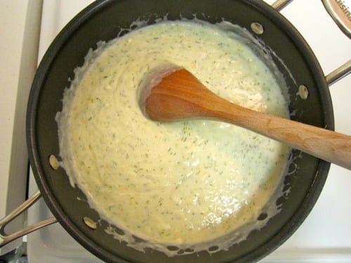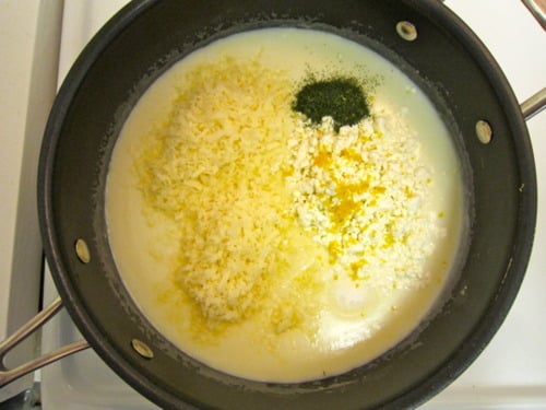 Remove from heat and stir in the remaining goat cheese, Gruyere, Asiago, remaining lemon zest, dill weed, salt and pepper.