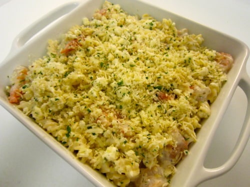 Spoon into prepared baking dish and sprinkle with reserved breadcrumb mixture.