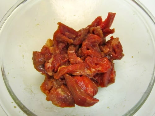 In a large bowl, whisk together 1/2 tablespoon (1 1/2 teaspoons) cornstarch, 1 1/2 tablespoons (4 1/2 teaspoons) soy sauce, 1/2 teaspoon sugar and 1/2 tablespoon (1 1/2 teaspoons) peanut oil. Add the steak and toss to coat; refrigerate until ready to cook.