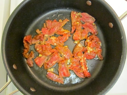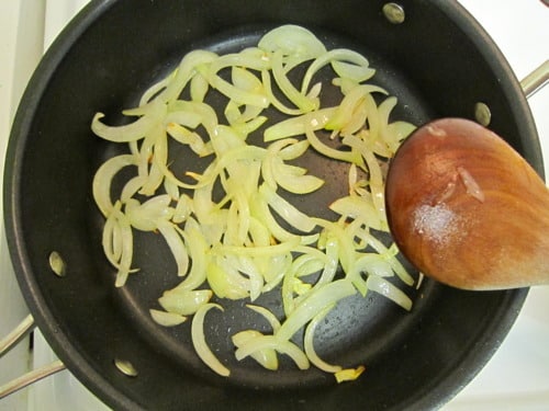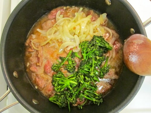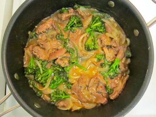 Heat 1 more tablespoon peanut oil in the saucepan. Add the onion and stir-fry for 2 to 3 minutes; transfer to a plate. (I wanted the onions to be more caramelized and tender so I stir-fried them for a bit longer, about 7 minutes.)