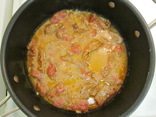 Heat remaining 2 tablespoons peanut oil in the saucepan and reduce heat to medium high. Add the garlic and steak and stir-fry 1 minute.