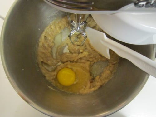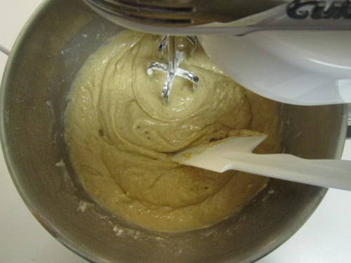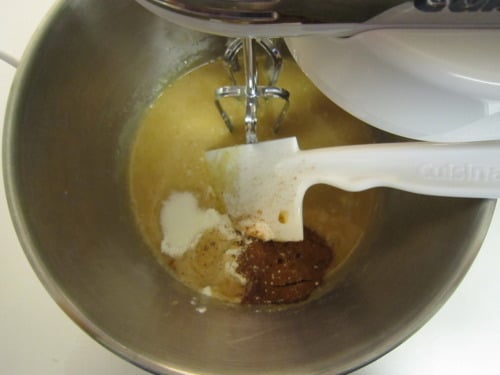 Add baking powder, baking soda, nutmeg, cinnamon, salt and vanilla on low speed until just combined.