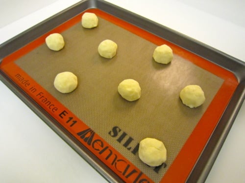 Place 1/2 cup sugar in a shallow bowl. Roll a heaping tablespoon of dough into a 1 1/2-inch ball and toss to coat in sugar.