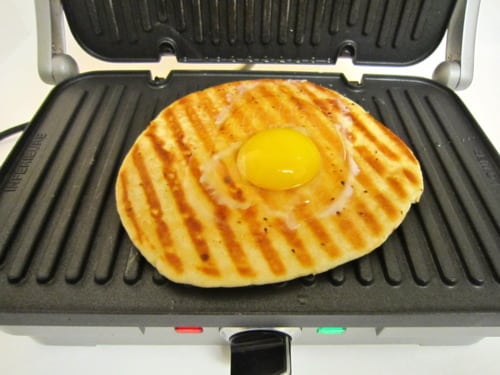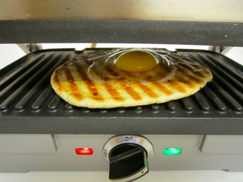 Crack 1 egg onto each pita. (Make sure that both your grill and pita are leveled. One of the eggs almost slid off the pita bread and onto the grill!)