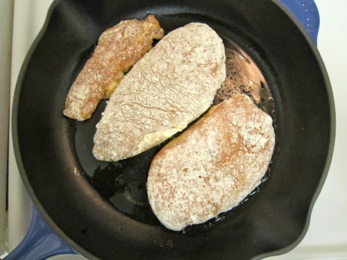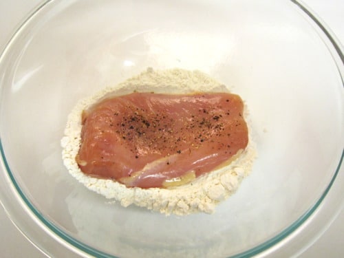 Working one at a time, dredge each chicken breast in the flour; shake to remove excess flour.