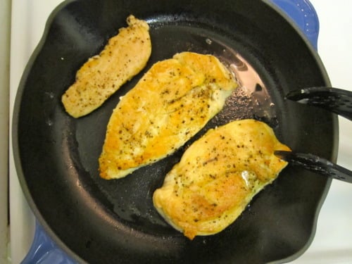Heat olive oil in a medium skillet over medium high heat. Add the chicken to the pan.