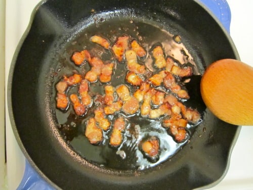 Add the bacon to the skillet and cook until brown and crispy, about 6-8 minutes. Transfer to a paper towel-lined plate.