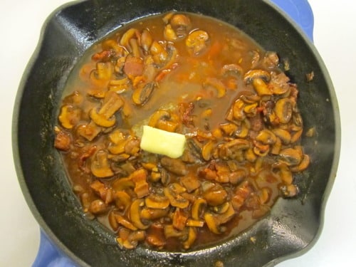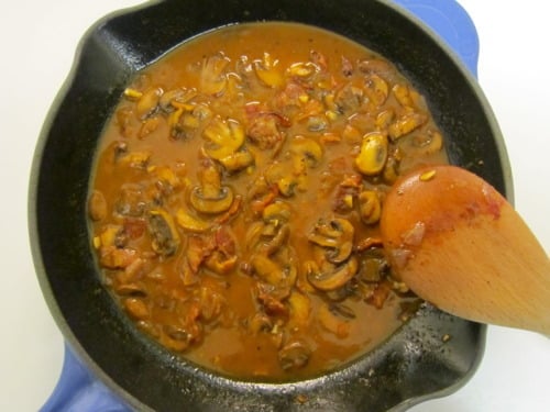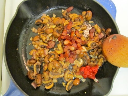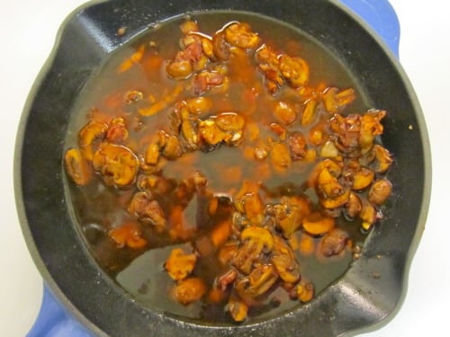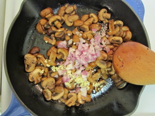 Add the mushrooms to the skillet and saute, stirring occasionally and scraping pan bottom, until liquid released by mushrooms evaporates and mushrooms begin to brown, about 8 minutes.
