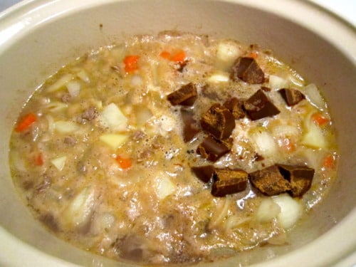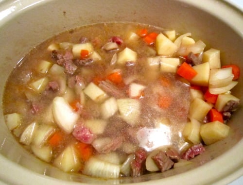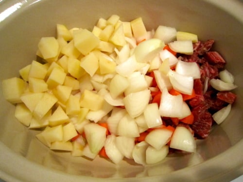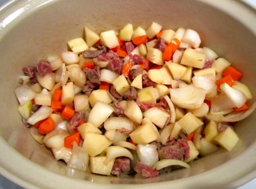 Heat oil in a Dutch oven over medium heat. Add the beef, potatoes, carrots and onions and saute until onions are lightly browned, about 4-5 minutes.