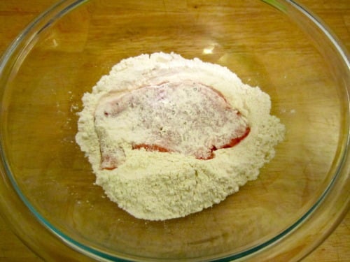 Working one at a time, dredge the cutlet in the flour, dip into the eggs, then dredge in the panko crumbs, pressing to coat.