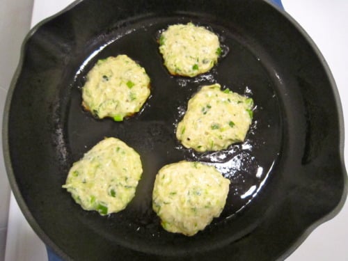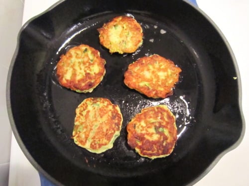 Heat olive oil in a medium skillet over medium high heat. Working in batches, add 2-tablespoon mounds of the zucchini batter to the hot oil, spreading them to form 3-inch fritters.