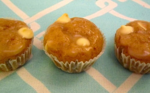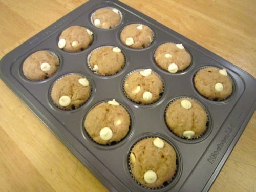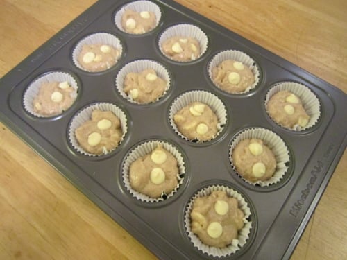 Scoop a tablespoon of batter evenly into the muffin tray. Sprinkle with remaining white chocolate chips, about 2 per muffin.