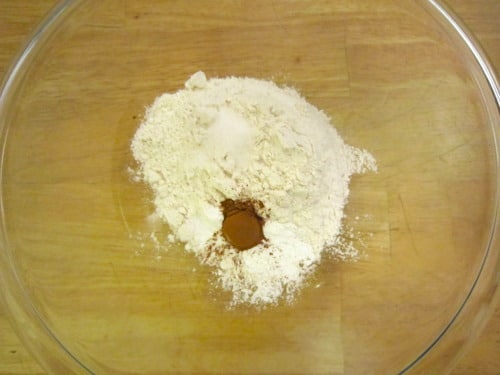 In a large bowl, combine the flour, baking soda, baking powder, cinnamon, salt and sugar.