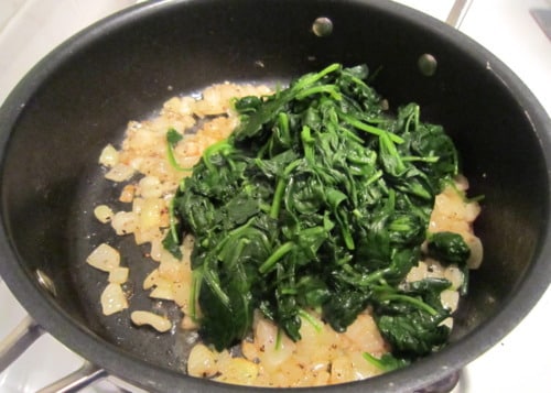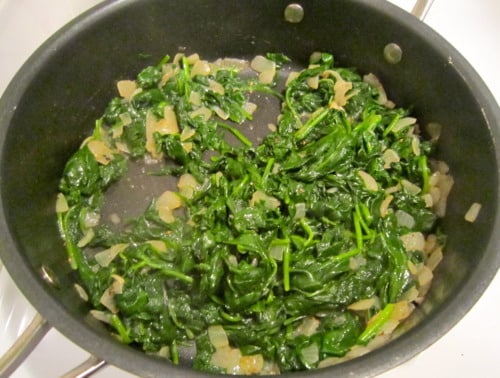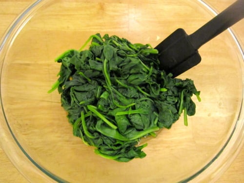Heat 3 tablespoons water in a saucepan over high heat. Add the spinach and shake the pan until spinach has wilted; drain well.