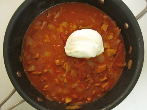 Remove from heat and stir in sour cream; season with salt and pepper, to taste.