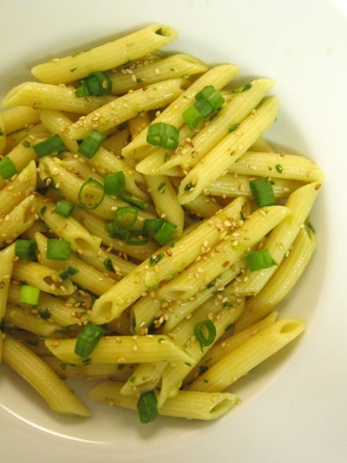 Thanks to the invention of the food processor, pesto making has become such a simple task, transforming a ten minute dinner into something amazing. The intriguing combination of basil, sesame seeds, soy sauce, garlic, lime juice, jalapenos, and olive oil tossed in penne pasta created a unique Italian-Asian Fusion dish. It had such a simplicity to it, yet it burst with spiciness from the jalapenos and such freshness from the lime juice. I added some Sriracha for that extra spicy kick and it served as a wonderful complement to the pasta. I enjoyed it very much for dinner and I’m sure I’ll enjoy it just as much when I eat this during class tomorrow!