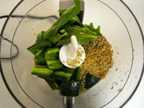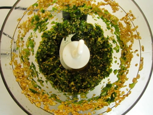 In the bowl of a food processor, combine the basil, 3 tablespoons sesame seeds, soy sauce, garlic, lime juice and jalapenos.