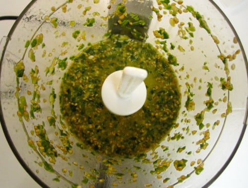 With the motor running, add 1/4 cup olive oil in a slow stream until emulsified.