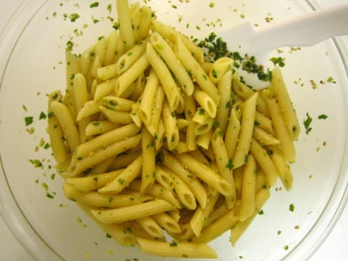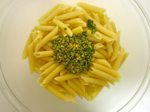 In a large bowl, immediately combine the hot pasta and pesto, allowing the flavors to soak.