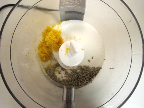 In the bowl of a food processor, combine the sugar, lemon zest and lavender until lavender is finely chopped. Reserve 2 tablespoons; set aside.