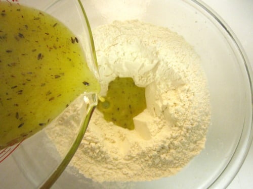 In a large glass measuring cup or another bowl, whisk together the lavender mixture, egg, buttermilk and oil.