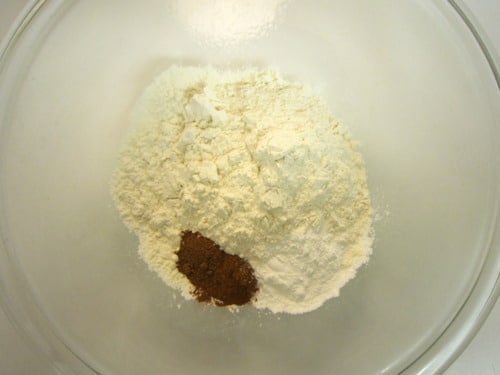 In a large bowl, combine the flour, baking powder, salt, nutmeg and cinnamon.