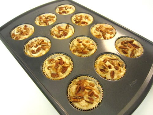 Scoop the batter evenly into the muffin tray. Sprinkle with cinnamon sugar and pecans.