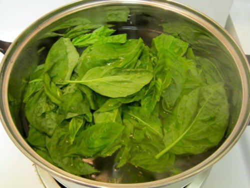 In a large pot of boiling salted water, blanche basil leaves until vibrant green, about 20-30 seconds.