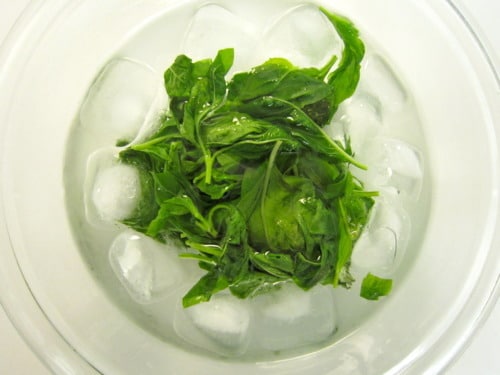 Using a slotted spoon, remove from boiling water and immediately immerse in an ice water bath (this will halt the cooking process); drain. Reserve boiling pot of water.