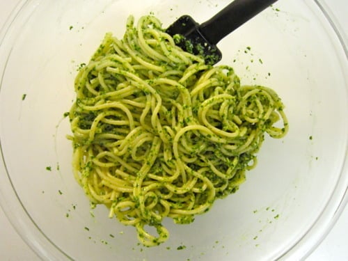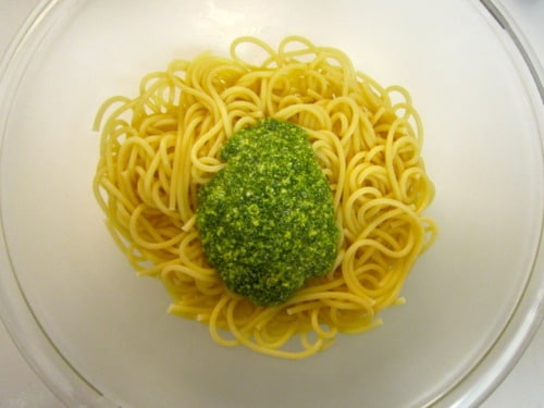 In a large bowl, immediately combine the hot pasta and pesto, allowing the flavors to soak. Add more pasta water as needed.