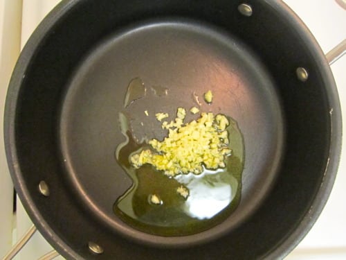 While the pasta is cooking, heat olive oil over medium heat in a large saucepan. Add the garlic and saute until fragrant, about 1 minute.