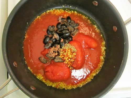Add the tomatoes, olives, anchovies, capers, oregano, and red-pepper flakes.