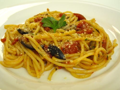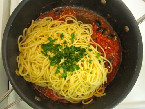 Spaghetti alla Puttanesca (adapted from Love & Olive Oil):