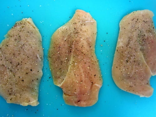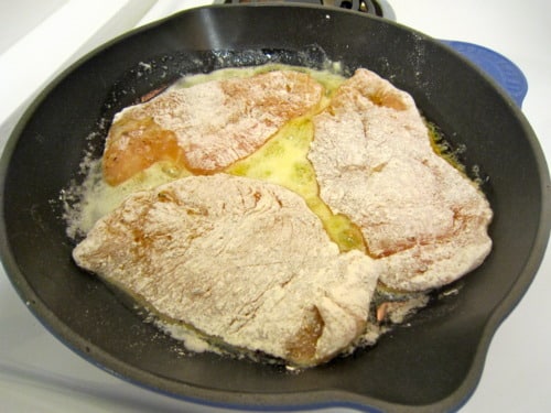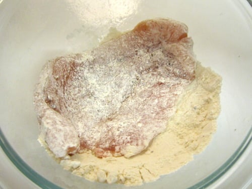 Working one at a time, dredge each chicken breast in the flour; shake to remove excess flour.