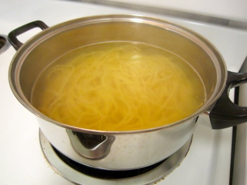In a large pot of boiling salted water, cook pasta according to package instructions; reserve 1/2 cup pasta water and drain well.
