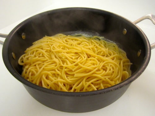 Every time Jason leaves for school in SF, I tend to become a temporary vegetarian. If I’m just cooking for one, I’m not going to buy a steak and grill it for myself. So when he’s gone, I like to make quick, simple meatless recipes like this one. It’s not only made with everyday ingredients but it’s the healthiest dinner I’ve ever made. It’s low in calories and it’s full of flavor! There’s a bit of a light creaminess from the raw egg yolks, a little bit of salt from the Parmesan, juicy, fresh flavors when you bite into the tomatoes, and a lasting refreshment from the basil. Now who says healthy food can’t be delicious?