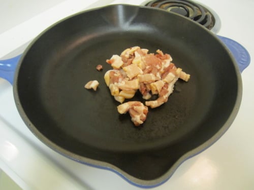 Heat a small skillet over medium high heat. Add the bacon and cook until brown and crispy, about 6-8 minutes. Transfer to a paper towel-lined plate, reserving the bacon fat.