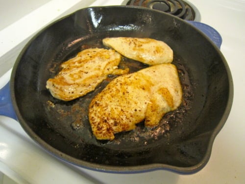 Add the chicken to the skillet with the reserved bacon fat and cook, in two batches, until golden brown, about 3-4 minutes per side. Transfer to a plate and let cool; cut into bite-sized pieces.