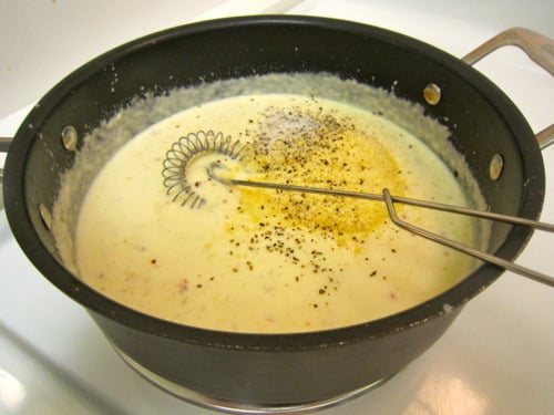 Whisk in the Parmesan, salt and pepper until the sauce has begun to thicken, about 3 minutes. Add more milk as needed to loosen.