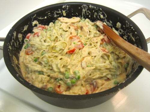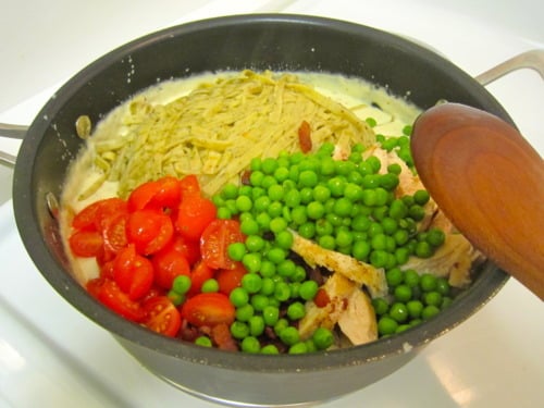 Add the pasta, bacon, chicken, tomatoes and peas and gently toss to combine.