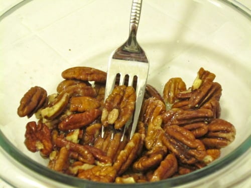 To caramelize the pecans, combine the pecans and egg white in small bowl. Remove the pecans with a fork, draining off as much of the egg white as possible.