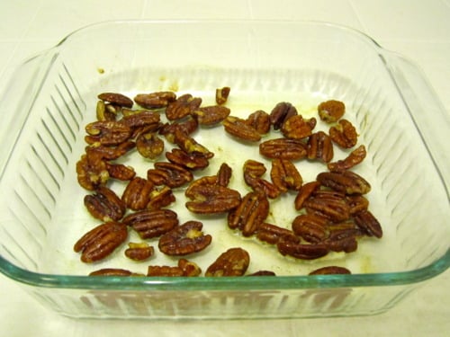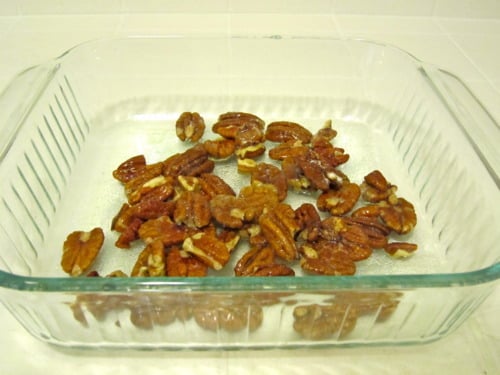 Place into oven and bake for 10 minutes, or until the pecans are dry. Let cool completely.