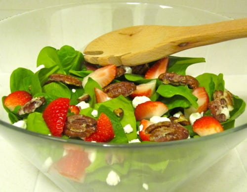 To assemble the salad, place the spinach in a large bowl; top with the goat cheese, strawberries and pecans. Pour the dressing on top of the salad and gently toss to combine. Serve immediately.