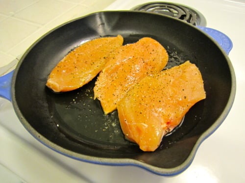 Heat the oil in a large skillet over medium high heat. Add the chicken and cook until golden brown, about 7-8 minutes per side.