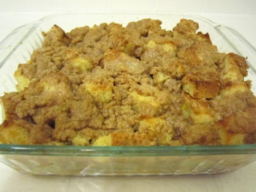 Now baked french toast has the same general concept of traditional french toast except it’s with cut-up bread cubes and it’s soaked in the milk-egg mixture overnight. Now the advantages are that it’s simpler, easier, and much more cleaner to make. There’s no need to get your hands all soaked in milk and eggs. But the best advantage of all is that it tastes 100x time better than regular french toast. There’s more substance in every bite since it’s a stack of bread cubes topped on one another, AND there’s that heavenly streusel topping. Mmmmmm.