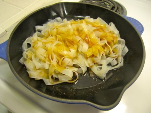 Note: If a bunch of rice noodles get stuck to the bottom of your skillet, be calm. I freaked out and thought my Le Creuset was forever damaged but after soaking it in some warm water for about 10 minutes, it just slid right off. So if it happens to you, just breathe!