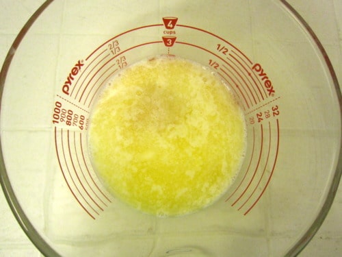 In a large glass measuring cup or another bowl, whisk together the butter, sugar, milk and egg.