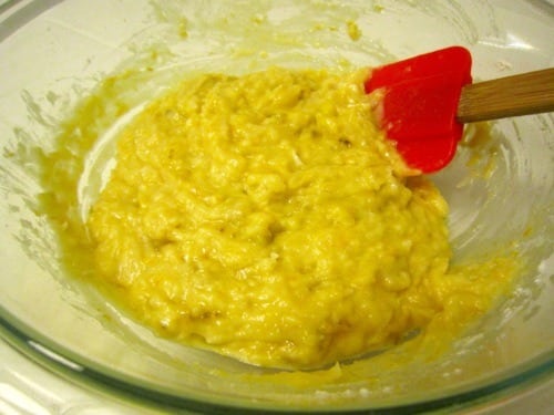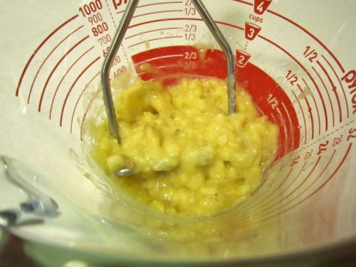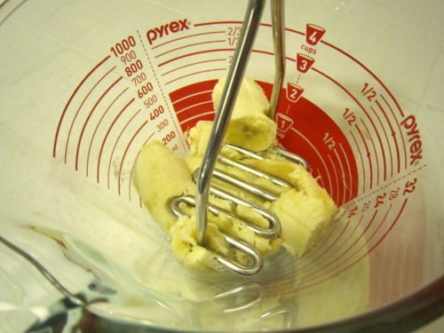 In a large glass measuring cup or another bowl, mash the bananas.