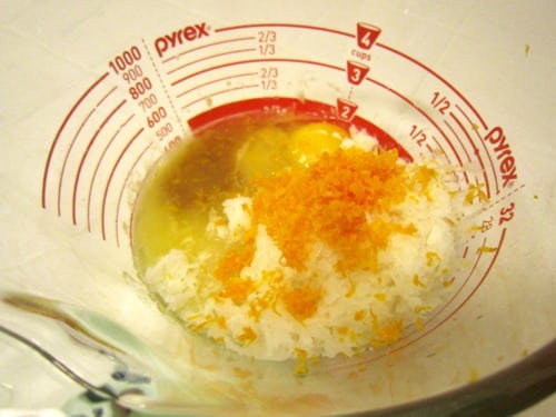 Add the butter, sugar, egg, vanilla, orange zest, orange juice and coconut; beat until well combined.